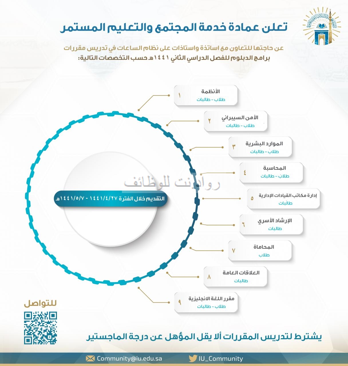 إعلان طرح وظائف للمفاضلة لترقيات الموظفين من داخل الجامعة منذ يومين آلية الدراسة خلال الفصل الدراسي الأول للعام الجامعي 1442 هـ. إعلان توظيف صادر عن الجامعة الهاشمية. أعلنت الجامعة الإسلامية م مثلة في عمادة خدمة المجتمع والتعليم المستمر عن حاجتها للتعاون مع أساتذة وأستاذات على نظام الساعات لحملة الماجستير فما فوق في تدريس مقررات برامج الدبلوم للعام الجامعي 1442هـ حسب التخصصات. الجامعة الإسلامية فى.