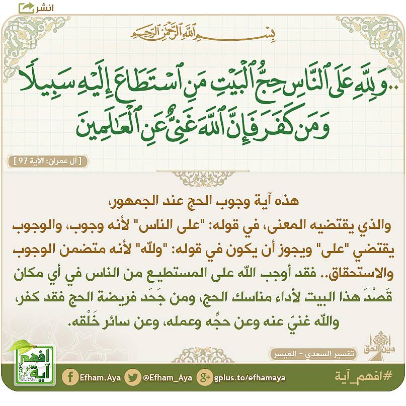 سفيرة الإسلام Su Twitter ولله على الناس حج البيت من استطاع إليه سبيلا ومن كفرفإن الله غني عن العالمين تصميمي من كتــاب التفسير الميسر