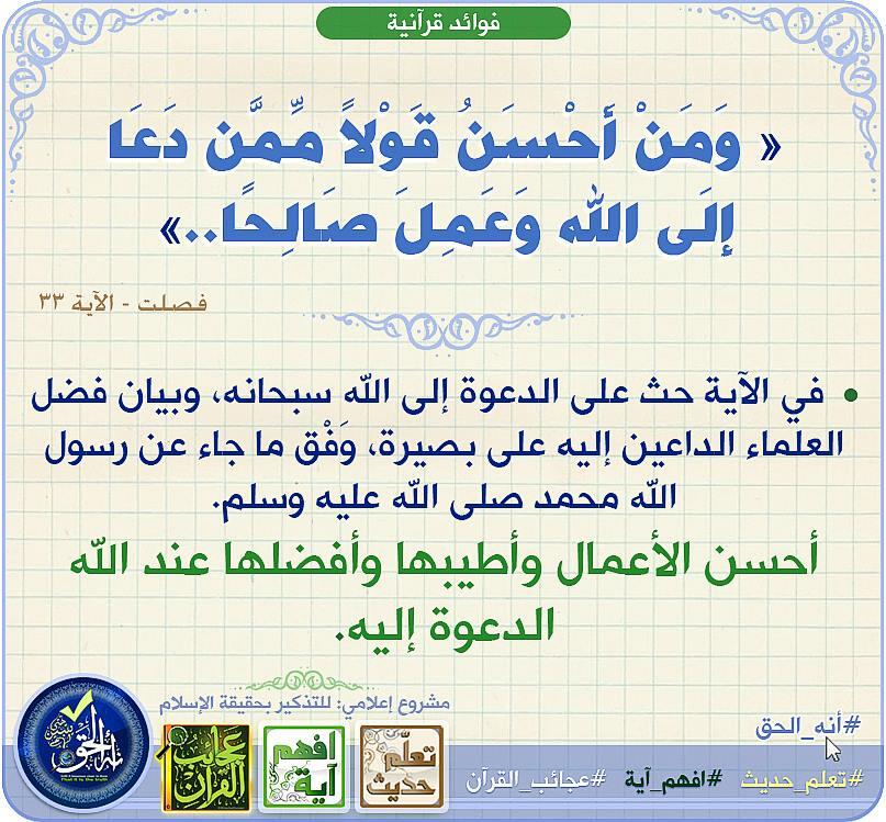 دين الحق On Twitter ومن أحسن قولا ممن دعا إلى الله وعمل صالحا أنه الحق تدبر أحسن الأعمال وأطيبها وأفضلها عند الله الدعوة إليه Http T Co Lgadlp6nyf