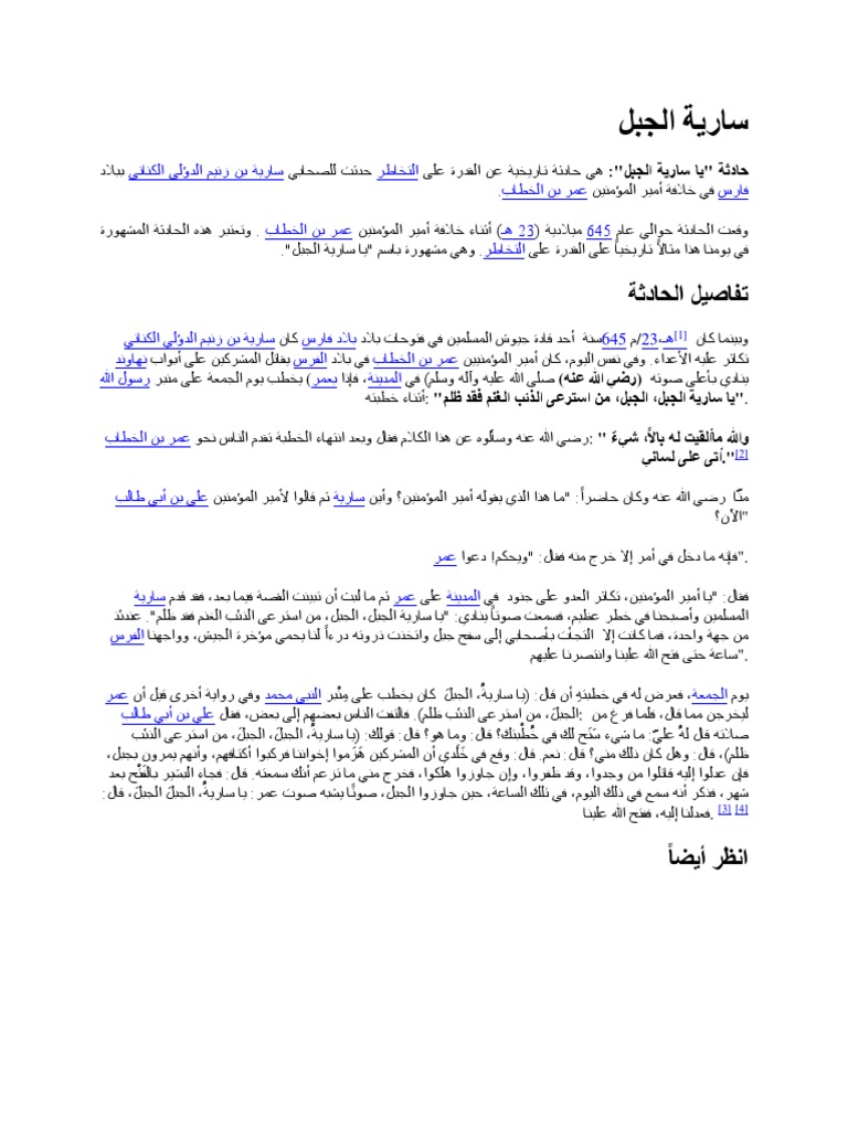 يا سارية الجبل. يستفاد منها ظهور كرامة أمير المؤمنين عمر بن الخطاب رضي الله عنه. هي حادثة تاريخية ضمن التراث الإسلامي عن القدرة على التخاطر حدثت للصحابي سارية بن زنيم الدؤلي الكناني ببلاد فارس في خلافة أمير المؤمنين عمر بن الخطاب. يا سارية الجبل لق د كان ف يما ق ب ل ك م م ن الأ م م م ح د ث ون عن أب ي ه ر ي ر ة قال. يا سارية الجبل يا سارية الجبل هو إلهام من الله تعالى له وليس هو من الكشف الصوفي المبتدع.